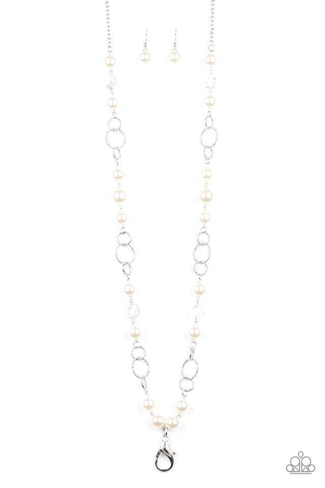 A refined collection of glassy white gems, textured silver rings, and pearly white beads drape across the chest for a timeless look. A lobster clasp hangs from the bottom of the design to allow a name badge or other item to be attached. Features an adjustable clasp closure.
