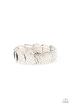 Delicately etched in abstract patterns, a collection of glistening silver discs are threaded along stretchy bands around the wrist for an overlapping reflective shimmer.
