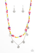 Multicolored seed beads are threaded along a wire, falling along the collar in a capricious pattern. Creating additional charm to the design, Pink Peacock seed bead flowers bloom amongst the bright pops of color. A delicate silver chain, infused with twinkling silver discs, layers with the colorful beads for a sassy, yet sweet, combo. Features an adjustable clasp closure.