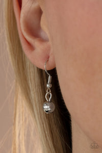 A purple shell-like half moon frame links to a shiny silver triangular plate at the bottom of a lengthened silver snake chain, creating a summery pendant. Features an adjustable clasp closure.
