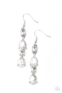 A glamorous collection of brilliant white teardrop and round rhinestones encased in classic silver pronged fittings stack together creating an irresistibly refined lure. Earring attaches to a standard fishhook fitting.