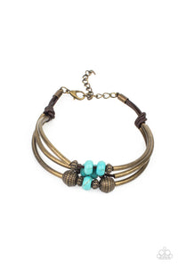 A mismatched collection of ornate brass accents, turquoise stone beads, and cylindrical brass bars are threaded along three rows of leathery brown cording, creating whimsical layers around the wrist. Features an adjustable clasp closure.