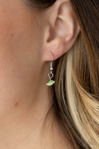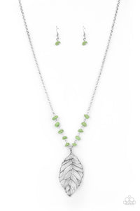 An airy lifelike silver leaf swings from the bottom of a green stone dotted chain, creating a colorful seasonal pendant. Features an adjustable clasp closure.