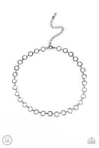 Dainty gunmetal rings link around the neck for a minimalist inspired shimmer. Features an adjustable clasp closure.