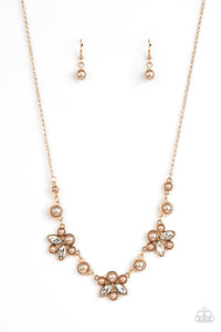 Infused with solitaire pearls, dainty clusters of bubbly champagne colored pearls and glassy white marquise style rhinestones delicately gather into clustered frames below the collar for an elegantly timeless finish. Features an adjustable clasp closure.