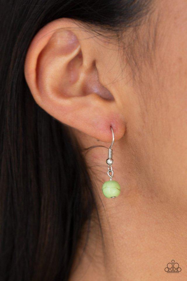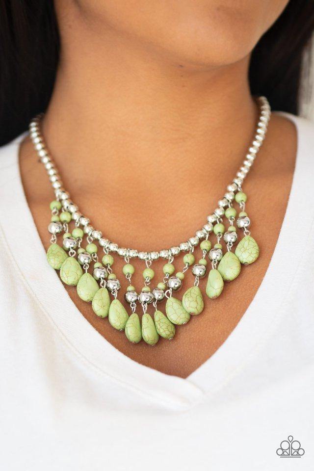 Shiny silver beads are threaded along an invisible wire below the collar. Infused with silver beaded accents, refreshing green stone beads swing from the bottom of the beaded strand, creating an earthy fringe. Features an adjustable clasp closure.