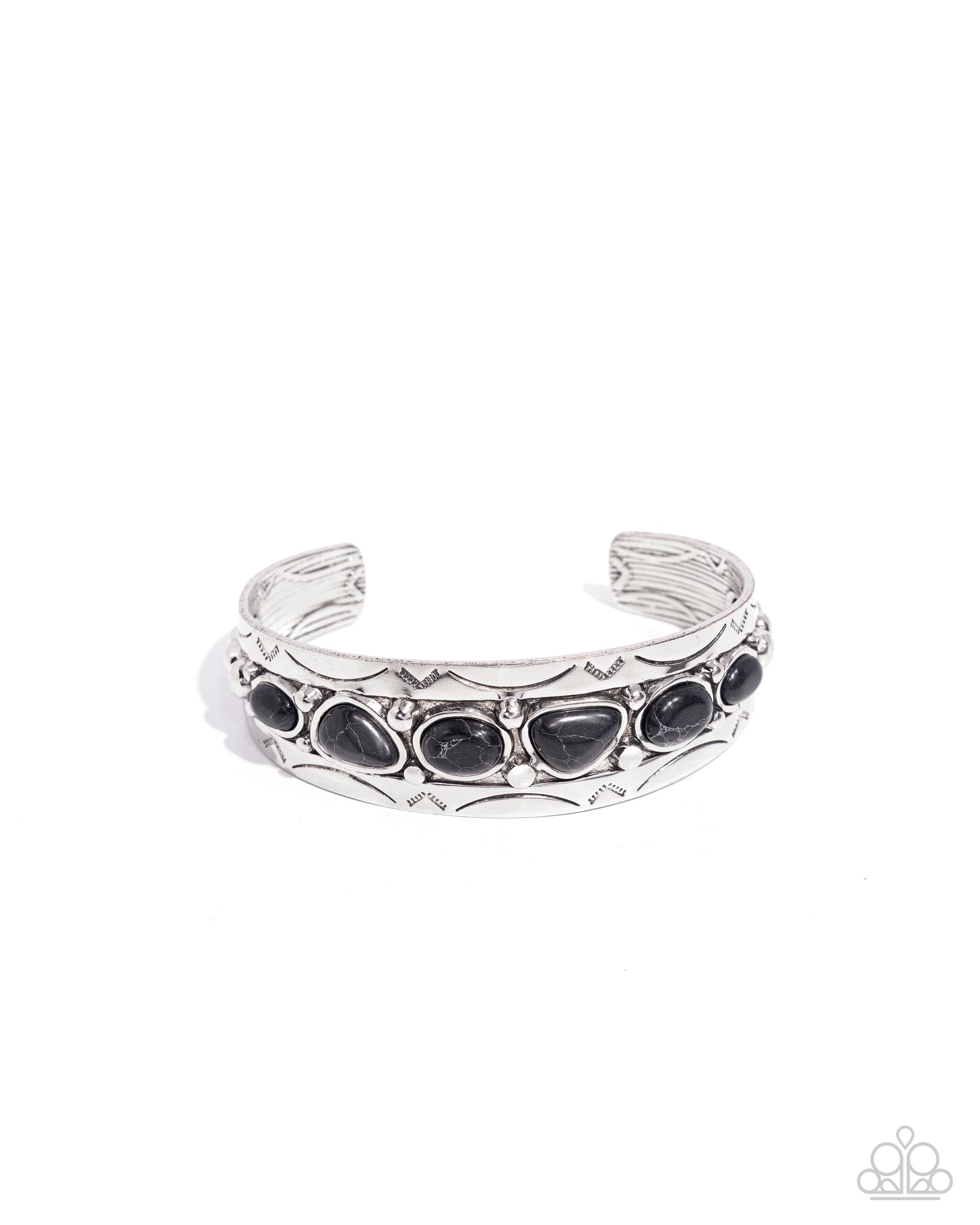 An asymmetrical collection of earthy black stones are encrusted across the studded center of a silver brass cuff stamped in tribal inspired textures, resulting in an authentic centerpiece around the wrist.
