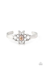 Flecked in shell-like shimmer, a glassy pink stone bead is pressed into the center of a shiny silver daisy frame that sits atop a dainty silver cuff for a seasonal flair.