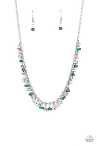 A variety of faceted Arcadia, Sailor Blue, and Harbor Mist beads swing from a shimmery silver chain, creating a flirtatious fringe below the collar. Faceted silver beads trickle between the colorful beads, adding a hint of shimmer to the seasonal design. Features an adjustable clasp closure.