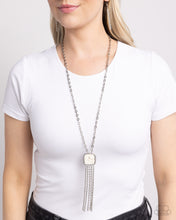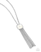 Flecked in shell-like iridescence, a white painted square silver frame swings from the bottom of a bold silver chain. A matching curtain of silver chains streams out from the bottom of the colorful pendant, adding a playful movement. Features an adjustable clasp closure.
