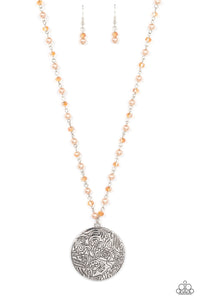 An oversized silver disc stamped in a whimsical floral motif swings from the bottom of a pearly and crystal-like brown beaded chain, resulting in a romantic cottagecore inspired pendant. Features an adjustable clasp closure.