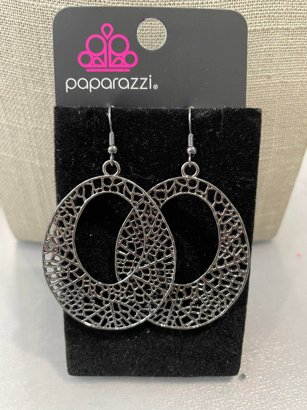 Featuring a shattered metallic pattern, glistening gunmetal filigree coalesces into an airy oval frame for a classic look. Earring attaches to a standard fishhook fitting. Sold as one pair of earrings.