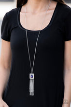 Swinging from the bottom of a lengthened silver chain, a delicately hammered square frame gives way to a shimmery silver fringe. Featuring a regal square cut, a glittery purple gem is pressed into the center of the pendant for an edgy look. Features an adjustable clasp closure.