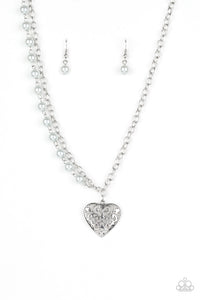 Swirling with filigree details, a whimsical heart pendant swings from the bottom of a shimmery silver chain below the collar. A single strand of pearly silver beads drape down one side for a refined asymmetrical finish. Features an adjustable clasp closure.