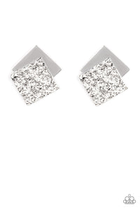 Embossed in gritty textures, a rough silver square overlaps a plain silver square, creating a stacked frame. Earring attaches to a standard post fitting.