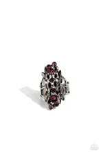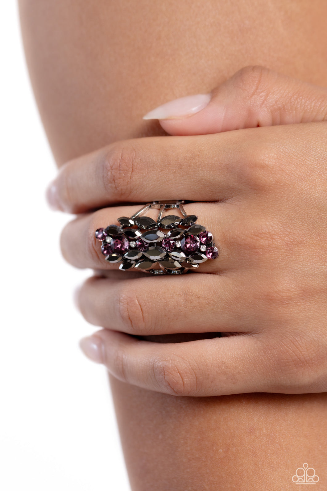 A cascade of dainty white, marquise cut hematite, and round purple rhinestones tumble down the finger, coalescing into a smoldering centerpiece. Features a stretchy band for a flexible fit.