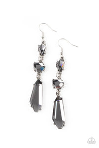 Featuring raw cuts, an asymmetrical collection of faceted smoky gems trickles from the ear, creating a smoldering chandelier. Earring attaches to a standard fishhook fitting.
