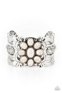 Earthy white stones adorn the center of a substantial silver cuff that is studded and embossed in scalloped and sunburst accents, creating a floral centerpiece around the wrist.