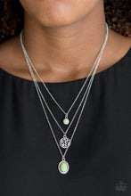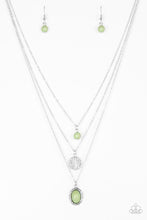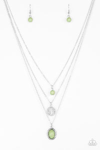Three shimmery silver chains layer down the chest. A refreshing green stone bead swings from the uppermost strand, above a radiant silver tree charm and an ornate refreshing green pendant for a seasonal look. Features an adjustable clasp closure.