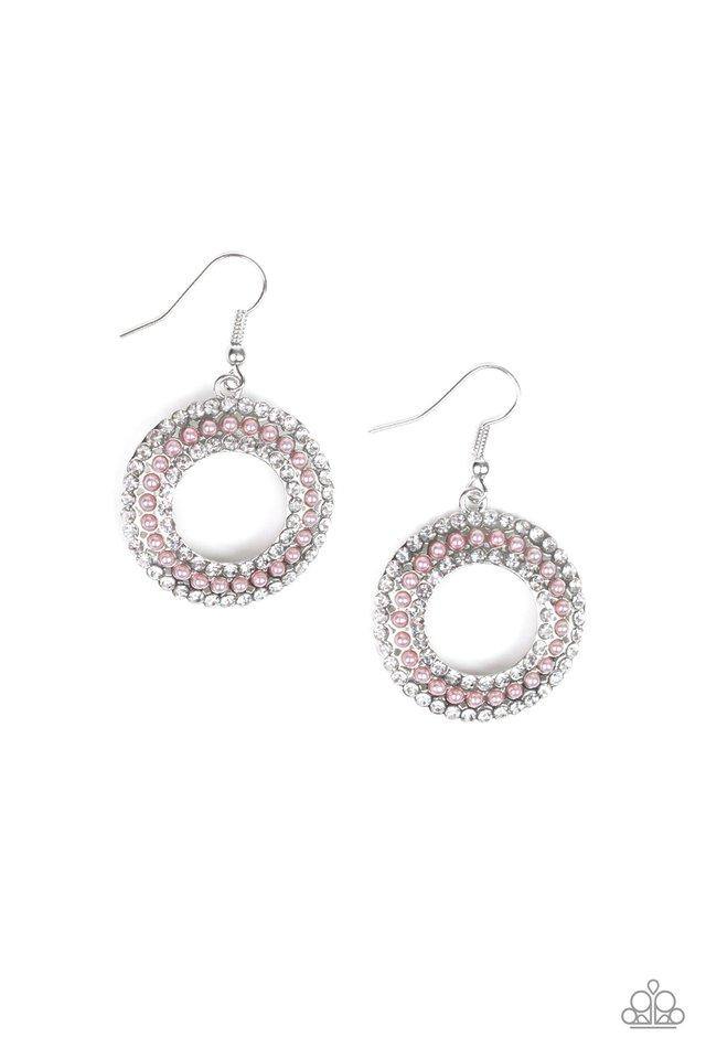 A ring of dainty pink pearls is flanked by rings of glassy white rhinestones, coalescing into a timeless piece. Earring attaches to a standard fishhook fitting.
