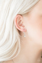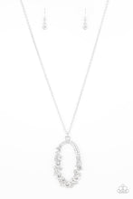 Varying in size, an array of glittery white rhinestones are encrusted along a shimmery silver hoop. The sparkling pendant swings from the bottom of an elongated silver chain for a glamorous finish. Features an adjustable clasp closure.