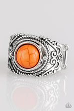A refreshing orange stone is pressed into an ornate silver band radiating with rope-like and studded textures for a seasonal look. Features a stretchy band for a flexible fit.