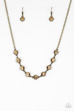 Encased in studded brass frames, golden topaz rhinestones link below the collar for a glamorous look. Features an adjustable clasp closure.