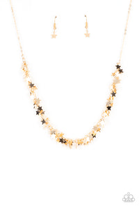 A glistening collection of dainty gold star charms delicately cluster on a classic gold chain, creating a stellar fringe below the collar. Features an adjustable clasp closure.