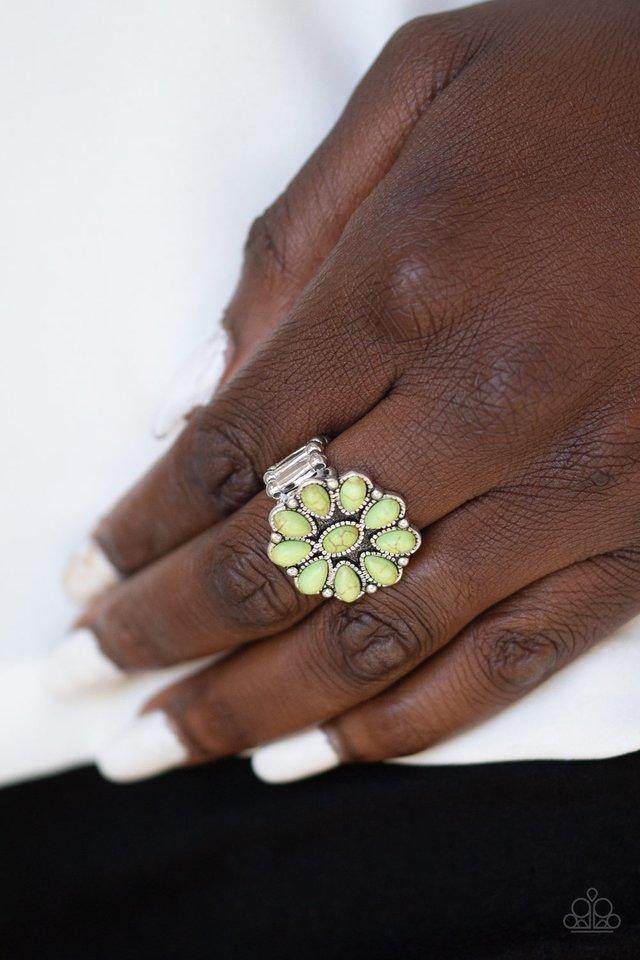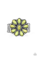 Featuring oval and teardrop refreshing green stones are pressed into a studded silver frame, creating an earthy flower atop the finger. Features a stretchy band for a flexible fit.