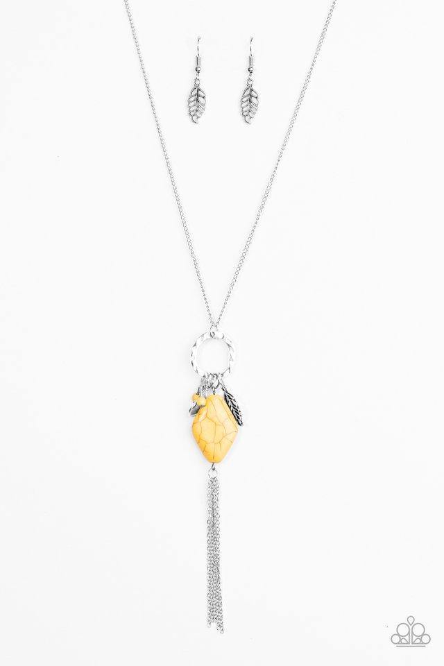 Sunny yellow stone accents and shimmery silver charms cascade from the bottom of a delicately hammered silver hoop, creating a whimsical tassel. Features an adjustable clasp closure. Sold as one individual necklace. Includes one pair of matching earrings.