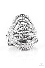 Countless dazzling white rhinestones are sprinkled along swooping gunmetal bands, creating a glamorous frame atop the finger. Features a stretchy band for a flexible fit.