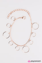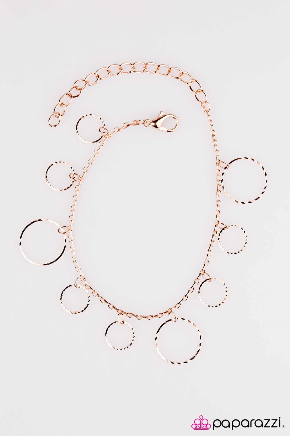 Featuring delicately etched surfaces, dainty copper hoops swing from the wrist in a dainty industrial fashion. Features an adjustable clasp closure.