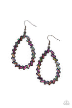 Featuring pronged gunmetal frames, a glittery collection of emerald cut oil spill rhinestones haphazardly stacks into an edgy teardrop for a gritty glamorous look. Earring attaches to a standard fishhook fitting.