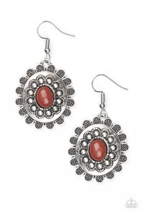 A robust brown bead is pressed into the center of an ornate floral frame for a summery look. Earring attaches to a standard fishhook fitting.