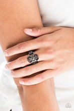 Brushed in a high-sheen finish, glistening gunmetal filigree swirls into a floral frame atop the finger for a seasonal look. Features a stretchy band for a flexible fit.