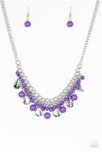Vivacious purple beads and curved silver teardrops swing from the bottom of interlocking silver chains, creating a flirtatious fringe below the collar. Features an adjustable clasp closure.