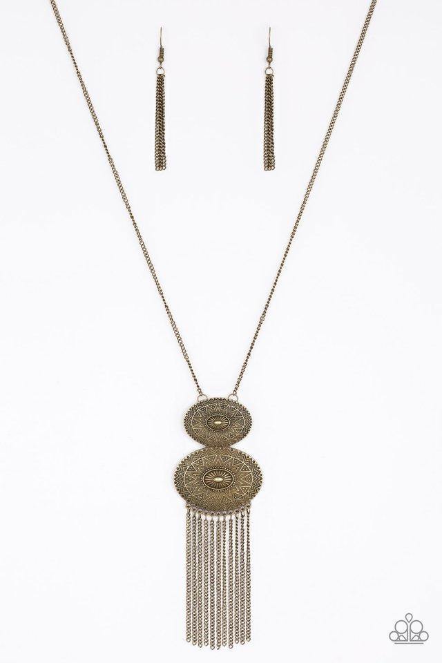 Embossed in radiant sunburst patterns, two oval brass frames connect at the bottom of a lengthened brass chain. Glistening brass chains stream from the bottom of the stacked pendant, adding a wanderlust flair to the tribal inspired look. Features an adjustable clasp closure.