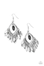 A polished black bead swings from the top of a marquise-shaped silver frame. Delicately hammered in antiqued texture, flared silver charms cascade from the bottom of the frame, creating a noisy fringe. Earring attaches to a standard fishhook fitting. Sold as one pair of earrings.