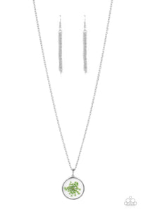 A dainty green firework-like flower is encased inside a glassy frame, creating a whimsical pendant below the collar. Features an adjustable clasp closure.