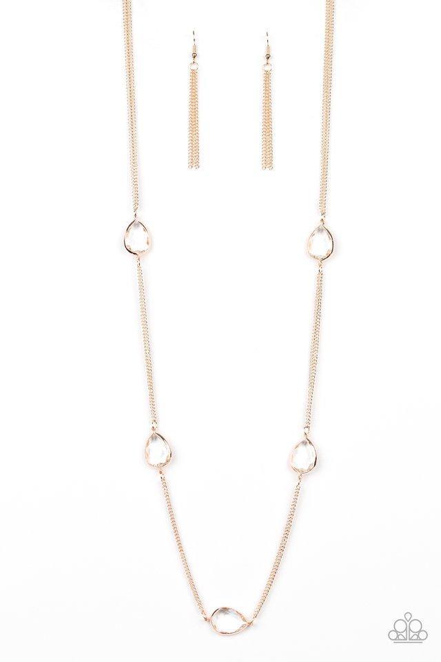 Glassy white teardrops attach to sections of rose gold chain across the chest, creating a refined display. Features an adjustable clasp closure.