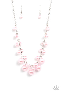 Gradually increasing in size, clusters of pink pearls alternate with dainty silver bars below the collar, creating a bubbly fringe. Features an adjustable clasp closure.