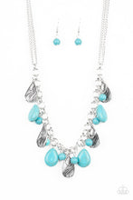 A collection of round and teardrop turquoise beads and decorative silver teardrops swing from the bottom of a double-linked silver chain, creating an earthy fringe below the collar. Features an adjustable clasp closure.