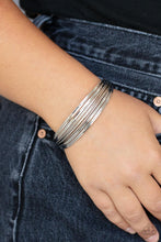 Capped in silver fittings, rows of smooth silver wires flank a section of diamond cut silver wire around the wrist, creating an edgy cuff.
