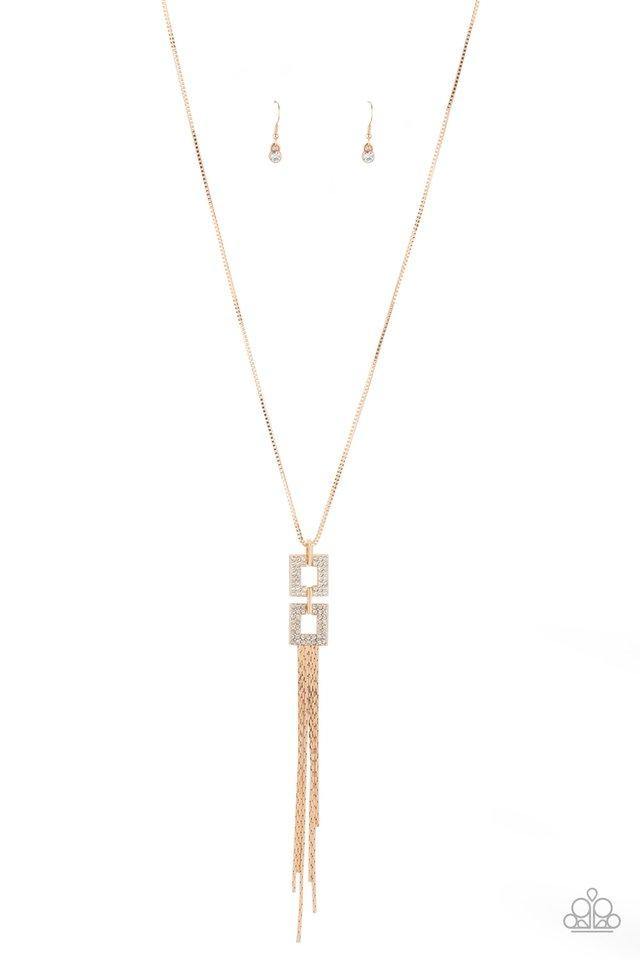 Encrusted in glittery white rhinestones, two gold square frames link at the bottom of a lengthened gold box chain. Flattened gold chains stream from the bottom of the stacked pendant, creating an edgy tassel. Features an adjustable clasp closure.