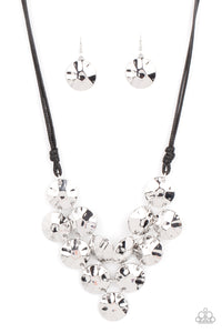 Featuring a hammered finish, a collection of shiny silver discs delicately connect into a netted pendant at the bottom of knotted black cords for a statement-making look. Features an adjustable clasp closure.