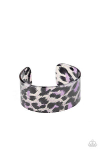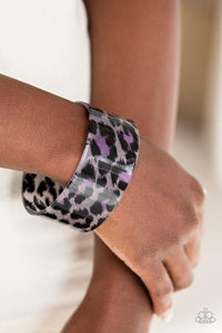Featuring a purple and black cheetah pattern, a thick acrylic cuff curls around the wrist for a wildly retro fashion.