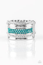 Blue and white rhinestone encrusted bands stack across the finger for a glamorous look. Features a stretchy band for a flexible fit.