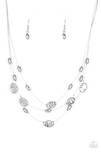 Featuring smooth and delicately hammered finishes, mismatched silver beads are threaded along dainty silver wire, creating floating layers below the collar. Features an adjustable clasp closure.