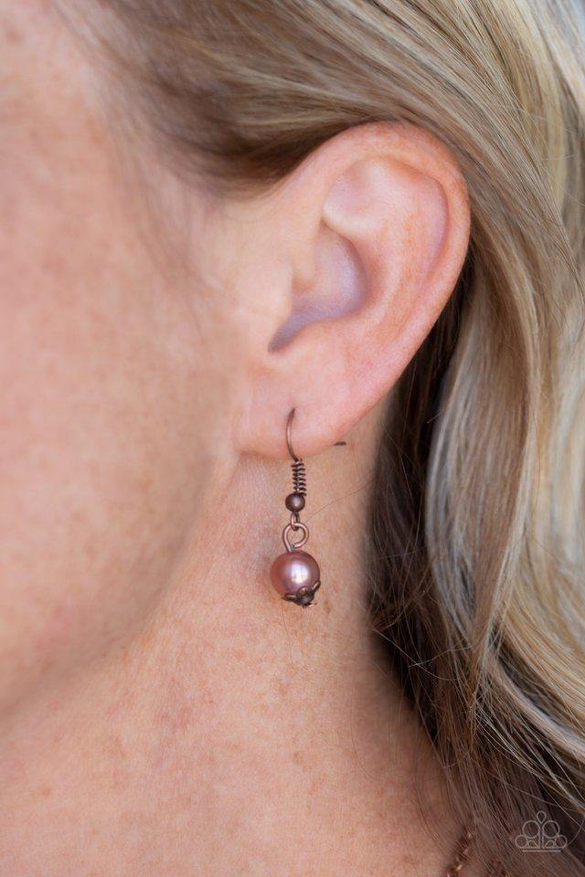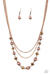 Infused with two layers of dainty copper chains, pearly copper beads and coppery aurum rhinestones link below the collar for a demure look. Features an adjustable clasp closure.
