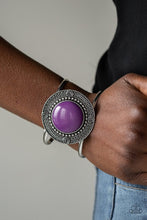 An oversized purple bead is pressed into the center of a round silver frame radiating with swirly filigree detail. The bold frame sits atop an airy silver cuff for a vibrant pop of color.
